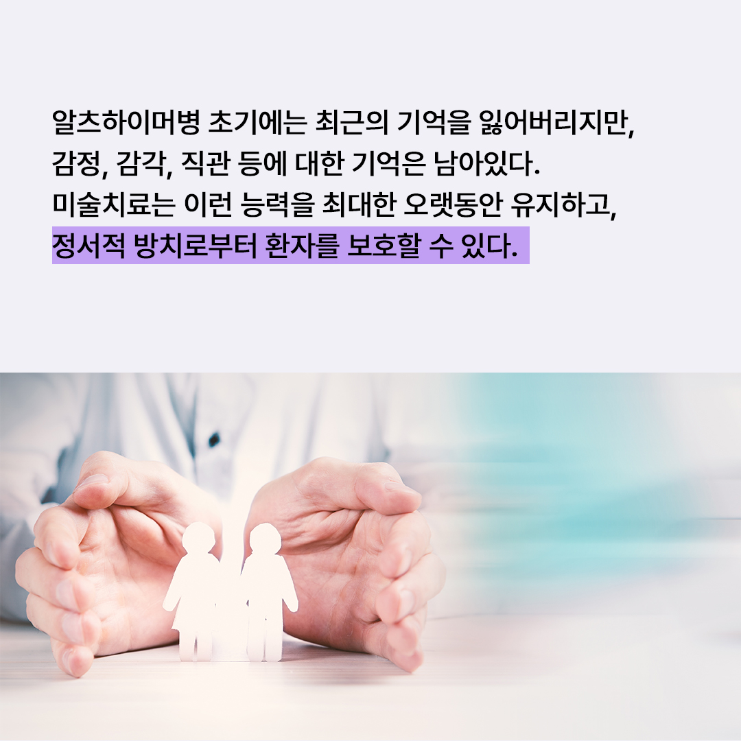 알츠하이머병의 초기에는 최근의 기억을 잃어버리고 다시 회복하기 어려운 모습을 보인다. 하지만 감정, 감각, 직관, 보편적 도덕규범 등에 대한 기억은 남아있다. 이런 기억은 우뇌와 관련이 있으며, 좌뇌보다 더 오래 기억되고 보존된다. 감정이 예전처럼 풍부하지 못하지만 계속 자신의 욕구와 취향 그리고 삶의 관점을 표현한다. 루스 아브라함은 미술치료가 효과적으로 이뤄지면 이런 능력을 최대한 오랫동안 유지할 수 있으며, 고립감, 우울감 등으로 인해 치매의 악화를 초래하는 정서적 방치로부터 환자를 보호할 수 있다고 강조한다.