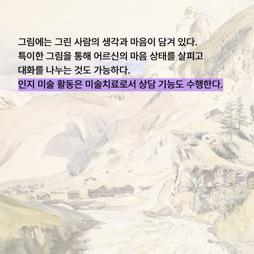 기분이 좋아지고 인지 자극을 통한 두뇌 운동을 하기 위해서만 그림을 그리거나 색칠 활동을 하지는 않는다. 그림에는 그린 사람의 생각이 들어 있고 색상은 마음의 상태를 알려 준다. 특이한 형태나 색상 사용을 하는 경우 유심히 어르신의 마음 상태를 살피고 대화를 통해 풀어낼 수 있도록 한다. 이처럼 인지 미술 활동은 미술치료로서 상담 기능 역할도 수행한다.