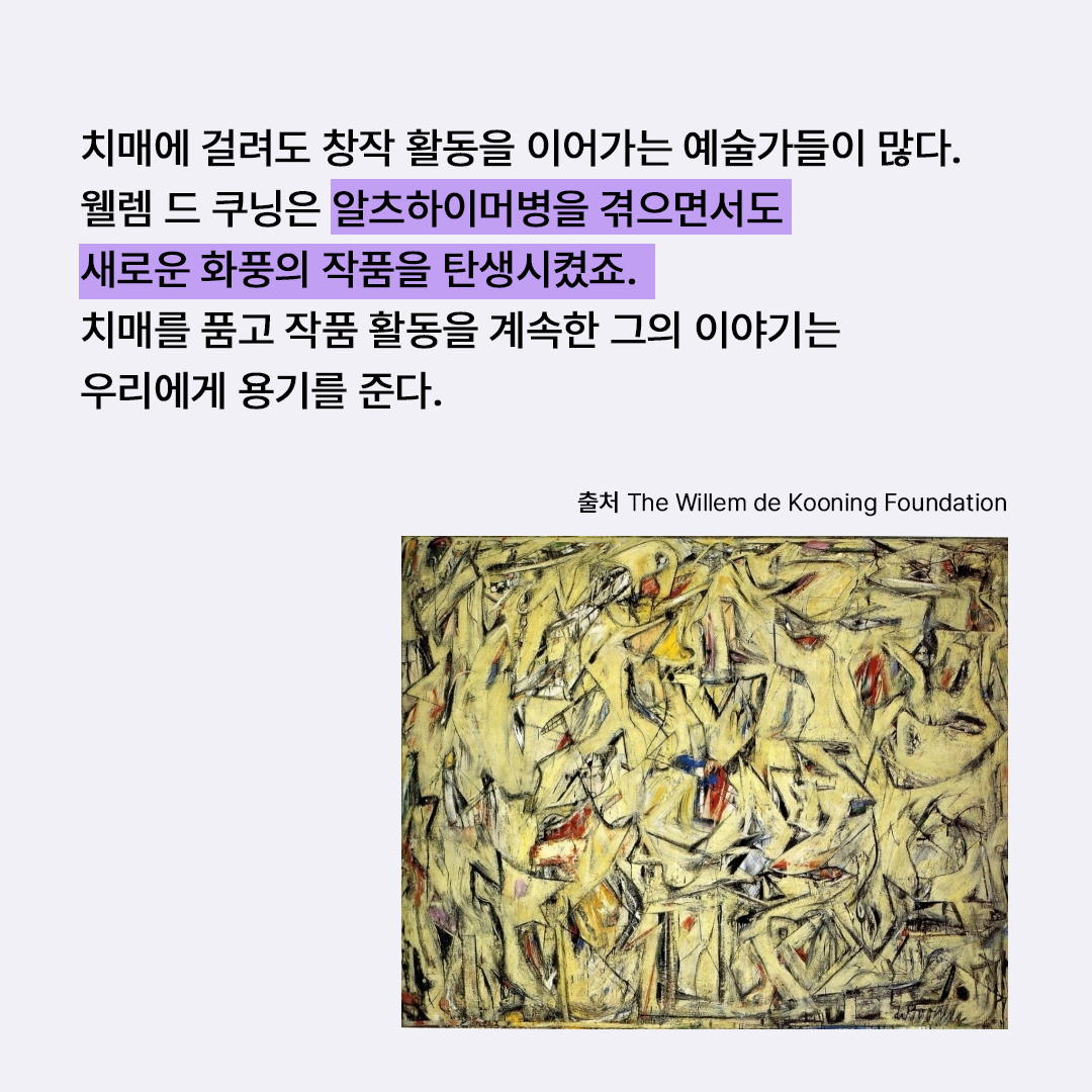 치매에 걸리면 무기력하게 살 것으로 생각하는 사람이 꽤 있을 것이다. 사람마다 다르겠지만 인지기능이 떨어지고 정신 건강이 나빠져도 자신의 창작 활동을 이어가는 예술가가 많다. 2차 세계대전 이후 등장해 미술사의 흐름을 바꾼 잭슨 폴록(1912~1956), 프란츠 클라인(1910~1962) 등 추상표현주의 작가들은 알코올 중독이나 우울증에 시달리면서도 훌륭한 작품을 남기고 짧은 생을 마감했다. 같은 시대에 왕성하게 활동하고 알코올 중독과 우울증에 시달린 웰렘 드 쿠닝(1904~1997)은 이들과 달리 92세까지 장수하며 작품 활동을 오랫동안 할 수 있었다. 심지어 치매에 걸렸음에도.