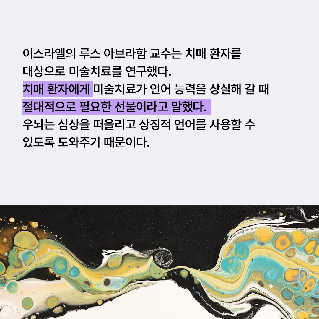 아브라함 교수는 치매 환자의 뇌가 언어 영역을 담당하는 기능이 떨어져 언어 표현에 어려움을 겪을 때 자신의 내면세계를 예술이라는 상징 언어를 사용해 대안적인 대화가 가능하다고 보았다. 그는 “이것이 언어가 그 뜻을 잃어버렸을 때 절대적으로 필요한 선물이 되는 것”이라고 말한다. 우뇌는 심상을 떠올리고 상징적 언어를 사용할 수 있도록 해주어 알츠하이머병 발병 뒤 좌뇌가 담당하는 언어 능력보다 그 능력이 더 오래 간다. 실어증 환자도 이미지를 통해 자기 경험을 드러낼 수 있고 긍정적인 감정을 말로 표현하지 못해도 이미지로 보여줄 수 있다. 이런 점에서 언어 능력을 상실해 가는 알츠하이머 환자들에게 미술치료가 유익하다고 볼 수 있다.
