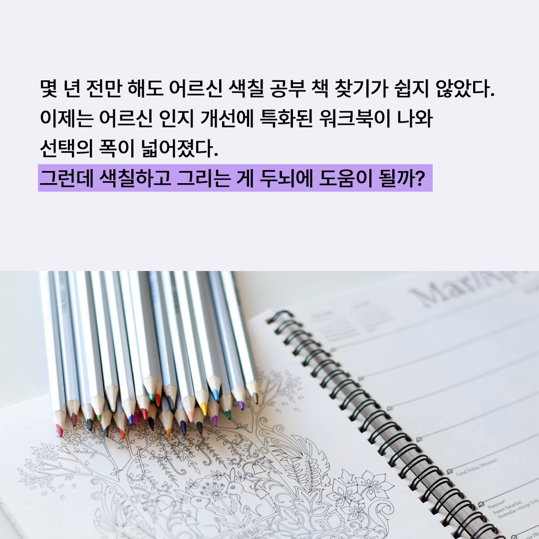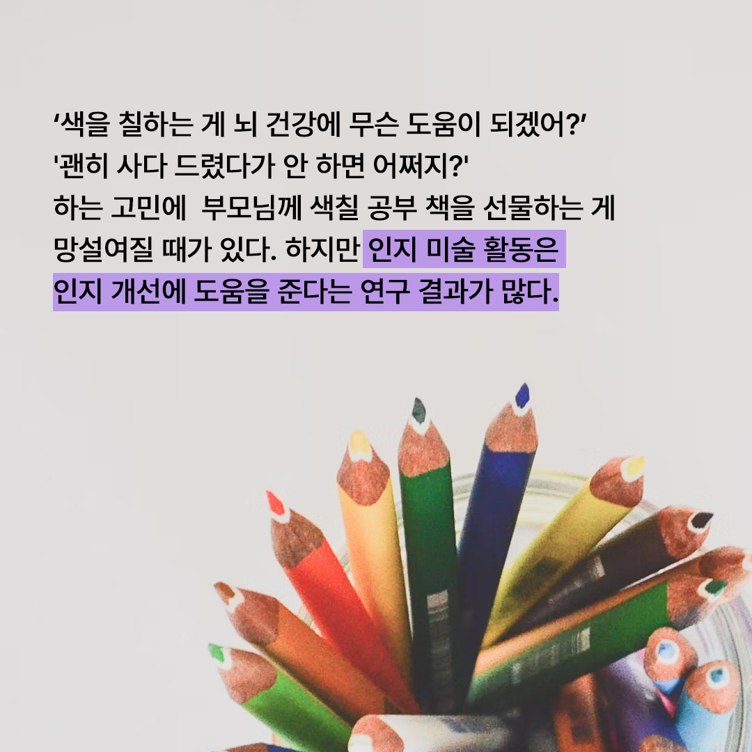고령 부모나 조부모를 위해 서점에서 색칠 공부 책을 고르면서 문득 ‘정해진 모양에 색을 칠하는 게 뇌 건강에 무슨 도움이 되겠어?’ 하는 의구심이 들 수 있다. ‘괜히 사다 드렸다가 사용 안 하면 무슨 낭패냐?’ 하는 생각도 들어서 사는 게 망설여지고, 부모님이 싫어할 것 같아 치매 검사라는 단어를 입에 올리기도 힘든데, 치매 예방하라고 색칠 공부 책을 사다 드리는 게 부담스러울 수도 있다. “아직 이런 것까지 할 정도는 아니다”라며 싫은 소리라도 하실 것 같아 걱정스럽다. 누군가 이런 활동이 뇌 건강에 도움이 된다고 확실히 말해 주면 얼마나 좋을까?