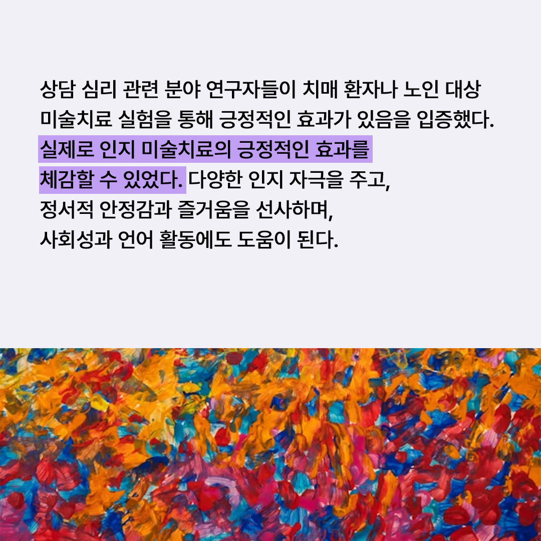 실제로 노인 교육 현장에서 인지 미술치료의 긍정적인 효과를 쉽게 체감할 수 있다. 개인적 경험으로 볼 때, 인지 미술 활동은 다양한 인지 자극을 주고, 정서적으로 안정감과 즐거움을 준다. 그리고 다양한 이야깃거리를 주기 때문에 사회성 활동과 언어 활동의 효과도 톡톡히 볼 수 있다. 손을 부지런히 움직여야 해서 소근육 운동으로도 안성맞춤인 활동이다. 멋진 밑그림을 예쁘게 칠하다 보면 아름다운 꽃을 볼 때 드는 행복감이 머릿속에 한 송이 한 송이 피어난다.